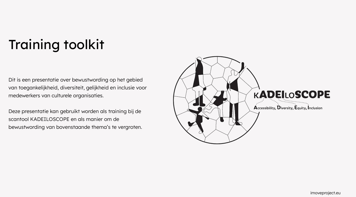 I MOVE is een Europees project over inclusie en toegankelijkheid in wetenschapscommunicatie. Binnen het project is de KADEILOSCOPE ontwikkeld, een methode, zelfanalysetool en werkboek ineen.